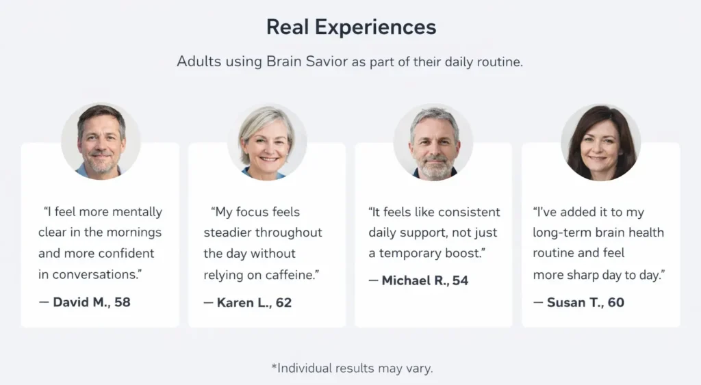Results vary from person to person. Some individuals report subtle improvements in clarity or focus earlier, while others prefer to evaluate changes over several weeks of consistent daily use. Because Brain Savior focuses on supporting underlying systems rather than masking symptoms, consistency is important.